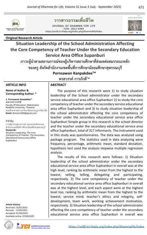 Situation Leadership of the School Administration Affecting the Core Competency of Teacher Under the Secondary Education Service Area Office Supanburi