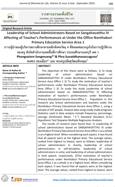 The results of research were found that: 1) Leadership of school administrators based on SANGAHAVATTHU IV under Nonthaburi Primary Educational Service Area Office 1 as a whole is at a highest level. When considering each aspect, it was found that all aspects were at the highest level. The average values, ranked from highest to lowest, were as follows: leadership of school administrators in charity; leadership of school administrators in self-discipline; leadership of school administrators in unity; and leadership of school administrators in kind speech, respectively. 2)The motivation of teacher’s performances under Nonthaburi Primary Educational Service Area Office 1 as a whole is at a highest level. When considering each aspect, it was found that all aspects were at the highest level. The average values, ranked from highest to lowest, were as follows: responsibility, nature of work performed, advancement, success of work, and respect, respectively. 3) Leadership of school administrators based on SANGAHAVATTHU IV Affecting motivation of teacher’s performances under Nonthaburi Primary Educational Service Area Office 1 the leadership of school administrators in terms of unity, the leadership of school administrators in terms of kindness of speech, and the leadership of school administrators in terms of charity, with a multiple correlation coefficient of 50.8 % (R2 = 0.508), with statistical significance at the .01 level, can be predicted in terms of raw scores and standard scores as follows: