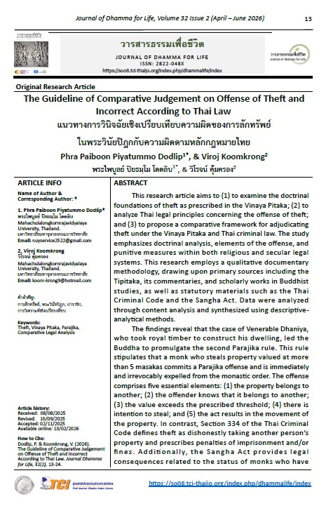 The findings reveal that the case of Venerable Dhaniya, who took royal timber to construct his dwelling, led the Buddha to promulgate the second Parajika rule. This rule stipulates that a monk who steals property valued at more than 5 masakas commits a Parajika offense and is immediately and irrevocably expelled from the monastic order. The offense comprises five essential elements: (1) the property belongs to another; (2) the offender knows that it belongs to another; (3) the value exceeds the prescribed threshold; (4) there is intention to steal; and (5) the act results in the movement of the property. In contrast, Section 334 of the Thai Criminal Code defines theft as dishonestly taking another person’s property and prescribes penalties of imprisonment and/or fines. Additionally, the Sangha Act provides legal consequences related to the status of monks who have incurred Parajika offenses. The comparative analysis demonstrates that both the Vinaya and Thai law emphasize intentionality and ownership as core elements of theft. However, they differ significantly in their underlying objectives and sanctions: the Vinaya seeks to preserve the moral purity and integrity of the monastic community, whereas criminal law aims to protect property rights and maintain public order. The research synthesizes these findings into the “TT Model,” a conceptual framework for systematically comparing legal principles, adjudicative criteria, and integrative approaches to moral and legal sanctions.