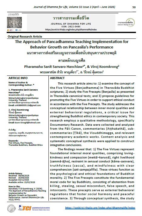 This research article aims to: 1) examine the concept of the Five Virtues (Benjadhamma) in Theravāda Buddhist scriptures; 2) study the Five Precepts (Benjasīla) as presented in Theravāda canonical texts; and 3) propose guidelines for promoting the Five Virtues in order to support ethical conduct in accordance with the Five Precepts. The study addresses the conceptual relationship between inner moral qualities and external behavioral regulations, a critical issue for strengthening Buddhist ethics in contemporary society. This research employs a qualitative methodology, specifically Documentary Research. Data were collected and analyzed from the Pāli Canon, commentaries (Aṭṭhakathā), sub-commentaries (Ṭīkā), the Visuddhimagga, and relevant contemporary academic works. Content analysis and systematic conceptual synthesis were applied to construct integrative conclusions.