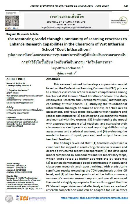 This research aimed to develop a supervision model based on the Professional Learning Community (PLC) process to enhance classroom action research competencies among teachers at Wat Intaram "Kovit Intrathorn" School. The study employed a Research and Development (R&D) methodology consisting of four phases: (1) studying the foundational information through document review, teacher needs assessment, and focus group discussions with teachers and school administrators; (2) designing and validating the model and manual with five experts; (3) implementing the model with a purposive sample of 16 teachers, and evaluating their classroom research practices and reporting abilities using assessments and statistical analyses; and (4) evaluating the model in terms of input, process, and output based on teachers’ feedback.