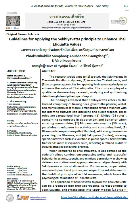 The application of Sekhiyavatta to promote Thai etiquette can be organized into four approaches, corresponding to Sekhiyavatta, and synthesized into SBDP Model: (1) S=Self-discipline, focusing on self-control; (2) B=Behavioral decorum, emphasizing polite conduct; (3) D=Dharma-based etiquette, rooted in Buddhist principles, and (4) P=Public respect, fostering respect for society and the environment. The findings highlight that Sekhiyavatta can systematically enhance public virtue and cultivate a culture of self- and mutual respect, particularly in an era where Thai etiquette faces challenges from globalization. This research holds academic, ethical, and policy-relevant value for revitalizing Thai cultural roots grounded in Buddhist principles, fostering a profound and sustainable cultural restoration.