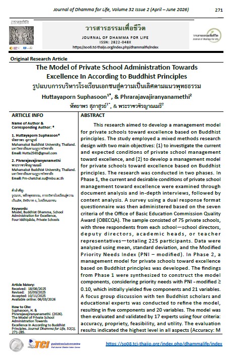 This research aimed to develop a management model for private schools toward excellence based on Buddhist principles. The study employed a mixed methods research design with two main objectives: (1) to investigate the current and expected conditions of private school management toward excellence, and (2) to develop a management model for private schools toward excellence based on Buddhist principles. The research was conducted in two phases. In Phase 1, the current and desirable conditions of private school management toward excellence were examined through document analysis and in-depth interviews, followed by content analysis. A survey using a dual response format questionnaire was then administered based on the seven criteria of the Office of Basic Education Commission Quality Award (OBECQA). The sample consisted of 75 private schools, with three respondents from each school—school directors, deputy directors, academic heads, or teacher representatives—totaling 225 participants. Data were analyzed using mean, standard deviation, and the Modified Priority Needs Index (PNI – modified). In Phase 2, a management model for private schools toward excellence based on Buddhist principles was developed. The findings from Phase 1 were synthesized to construct the model components, considering priority needs with PNI – modified ≥ 0.10, which initially yielded five components and 21 variables. A focus group discussion with ten Buddhist scholars and educational experts was conducted to refine the model, resulting in five components and 20 variables. The model was then evaluated and validated by 17 experts using four criteria: accuracy, propriety, feasibility, and utility. The evaluation results indicated the highest level in all aspects (Accuracy: M = 4.82, SD = 0.39; Propriety: M = 4.88, SD = 0.33; Feasibility: M = 4.76, SD = 0.44; Utility: M = 5.00, SD = 0.00).