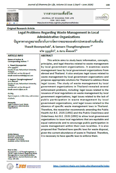 This article aims to study basic information, concepts, principles, and legal theories related to waste management by local government organizations. It examines waste management laws by local government organizations from abroad and Thailand. It also analyzes legal issues related to waste management by local government organizations and proposes appropriate solutions for Thailand to address these legal issues. The study of waste management by local government organizations in Thailand revealed several enforcement problems, including: legal issues related to the issuance of local regulations on waste management by local government organizations; legal issues related to the lack of public participation in waste management by local government organizations; and legal issues related to the absence of specific waste management laws in Thailand. Therefore, the researcher recommends amending the Public Health Act B.E. 2535 (1992) and the Public Cleanliness and Orderliness Act B.E. 2535 (1992) to allow local government organizations to issue local regulations that are equitable and equal nationwide and to encourage public participation in waste management within their own localities. It is also proposed that Thailand have specific laws for waste disposal, given the current abundance of waste in Thailand. Therefore, it is necessary to have specific laws to enforce them.