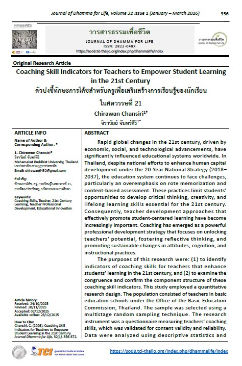 The purposes of this research were: (1) to identify indicators of coaching skills for teachers that enhance students’ learning in the 21st century, and (2) to examine the congruence and confirm the component structure of these coaching skill indicators. This study employed a quantitative research design. The population consisted of teachers in basic education schools under the Office of the Basic Education Commission, Thailand. The sample was selected using a multistage random sampling technique. The research instrument was a questionnaire measuring teachers’ coaching skills, which was validated for content validity and reliability. Data were analyzed using descriptive statistics and confirmatory factor analysis to verify the construct validity and model fit. The findings revealed that the indicators of teachers’ coaching skills comprised multiple components that demonstrated good congruence with empirical data and met acceptable statistical criteria. The confirmed model indicates that coaching skills are a crucial factor in enhancing students’ learning and competencies required in the 21st century. The results of this study provide empirical evidence that can inform teacher professional development programs and support the improvement of instructional practices aligned with 21st-century educational goals.