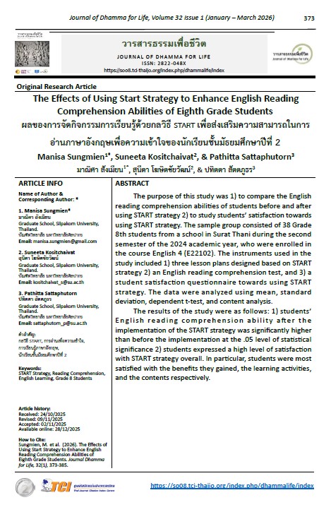 The purpose of this study was 1) to compare the English reading comprehension abilities of students before and after using START strategy 2) to study students’ satisfaction towards using START strategy. The sample group consisted of 38 Grade 8th students from a school in Surat Thani during the second semester of the 2024 academic year, who were enrolled in the course English 4 (E22102). The instruments used in the study included 1) three lesson plans designed based on START strategy 2) an English reading comprehension test, and 3) a student satisfaction questionnaire towards using START strategy. The data were analyzed using mean, standard deviation, dependent t-test, and content analysis.