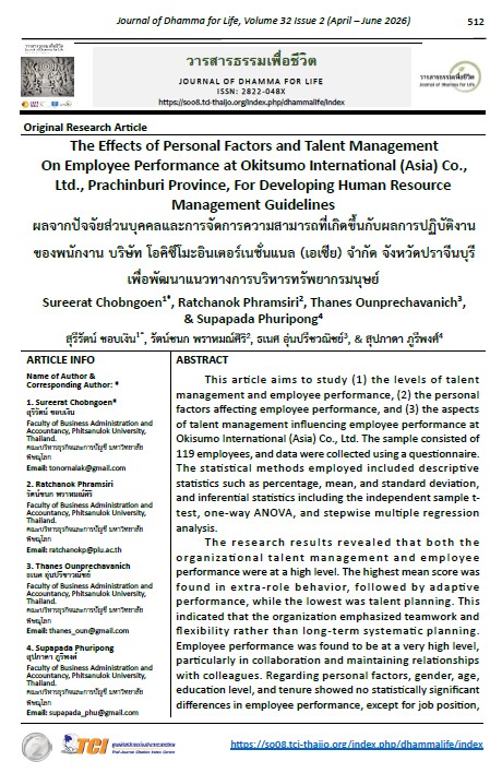 This article aims to study (1) the levels of talent management and employee performance, (2) the personal factors affecting employee performance, and (3) the aspects of talent management influencing employee performance at Okisumo International (Asia) Co., Ltd. The sample consisted of 119 employees, and data were collected using a questionnaire. The statistical methods employed included descriptive statistics such as percentage, mean, and standard deviation, and inferential statistics including the independent sample t-test, one-way ANOVA, and stepwise multiple regression analysis.