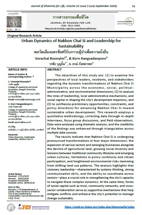 The objectives of this study are: (1) to examine the perspectives of local leaders, residents, and stakeholders regarding the dynamic transformations of Nakhon Chai Si Municipality across the economic, social, political-administrative, and environmental dimensions; (2) to analyze the roles of leadership, local administrative mechanisms, and social capital in shaping the city’s development trajectory; and (3) to synthesize preliminary opportunities, constraints, and policy directions for advancing Nakhon Chai Si toward sustainable urban development. This research employs a qualitative methodology, collecting data through in-depth interviews, focus group discussions, and field observations. Data were analyzed using thematic analysis, and the credibility of the findings was enhanced through triangulation across multiple data sources.