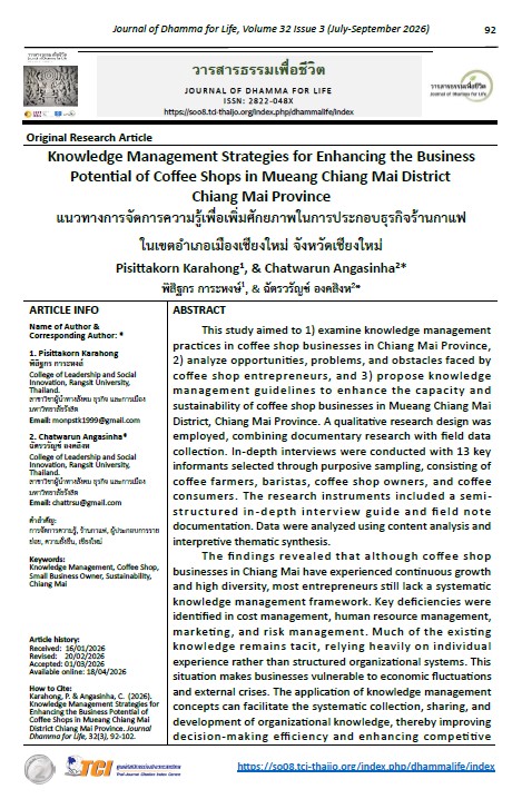 This study aimed to 1) examine knowledge management practices in coffee shop businesses in Chiang Mai Province, 2) analyze opportunities, problems, and obstacles faced by coffee shop entrepreneurs, and 3) propose knowledge management guidelines to enhance the capacity and sustainability of coffee shop businesses in Mueang Chiang Mai District, Chiang Mai Province. A qualitative research design was employed, combining documentary research with field data collection. In-depth interviews were conducted with 13 key informants selected through purposive sampling, consisting of coffee farmers, baristas, coffee shop owners, and coffee consumers. The research instruments included a semi-structured in-depth interview guide and field note documentation. Data were analyzed using content analysis and interpretive thematic synthesis.