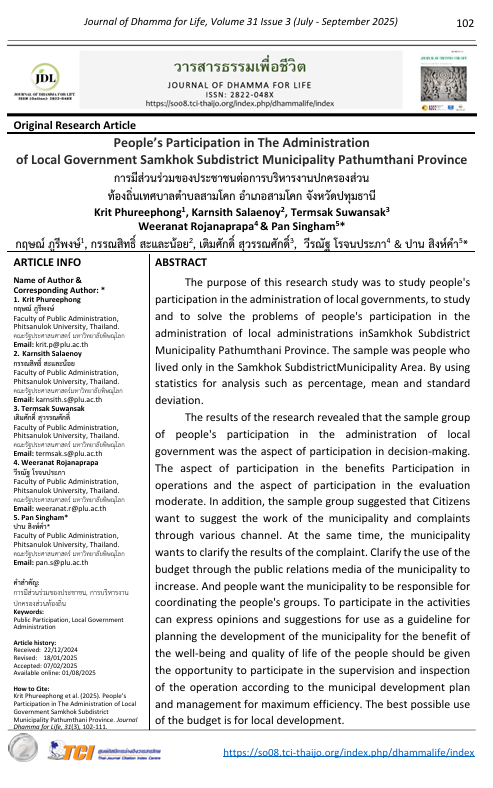 People’s Participation in The Administration of Local Government Samkhok Subdistrict Municipality Pathumthani Province